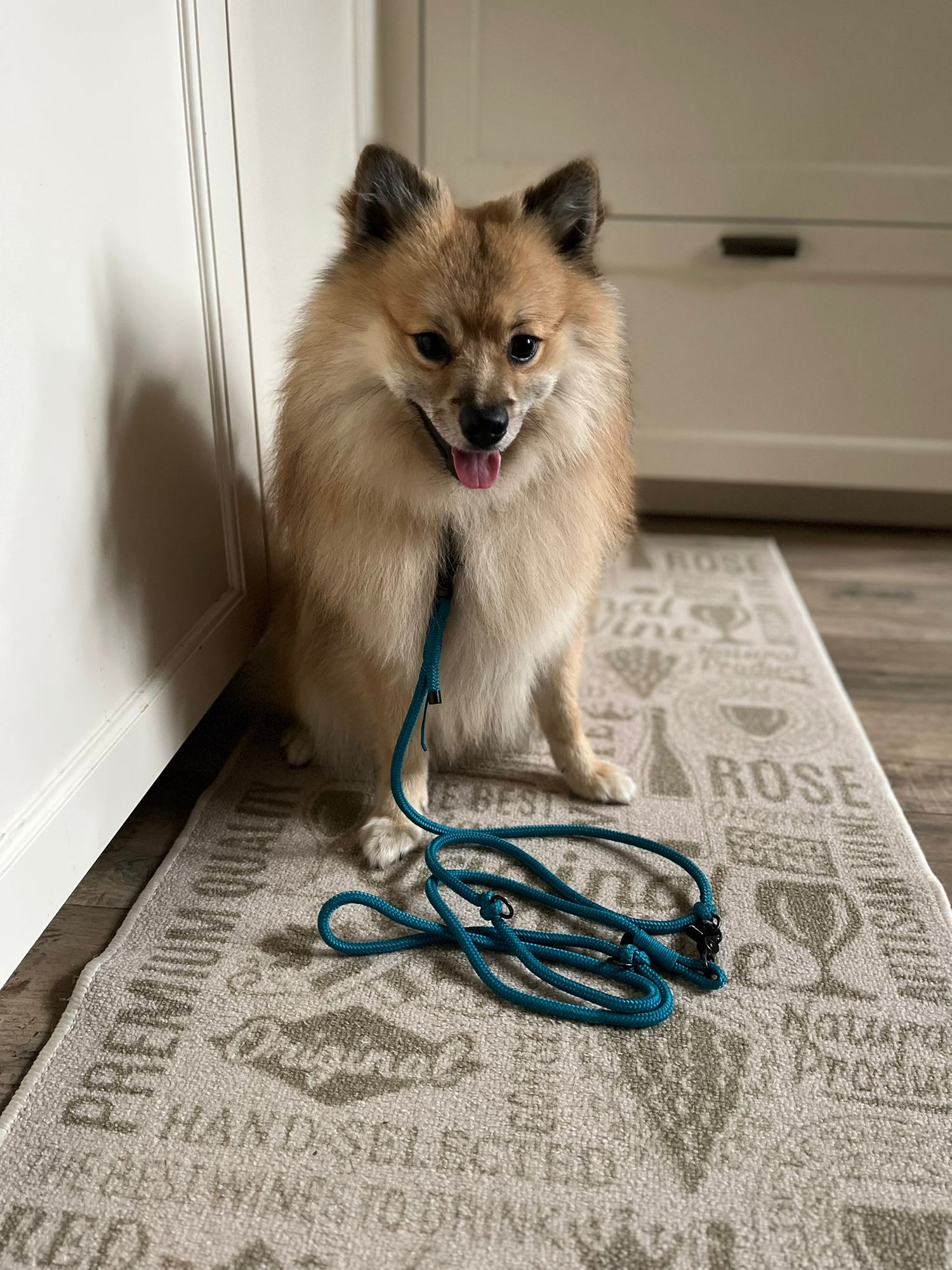 Leo zeigt seine neue 2 m-Leine in Aqua – schlicht, stylisch und einfach praktisch für jeden Spaziergang.