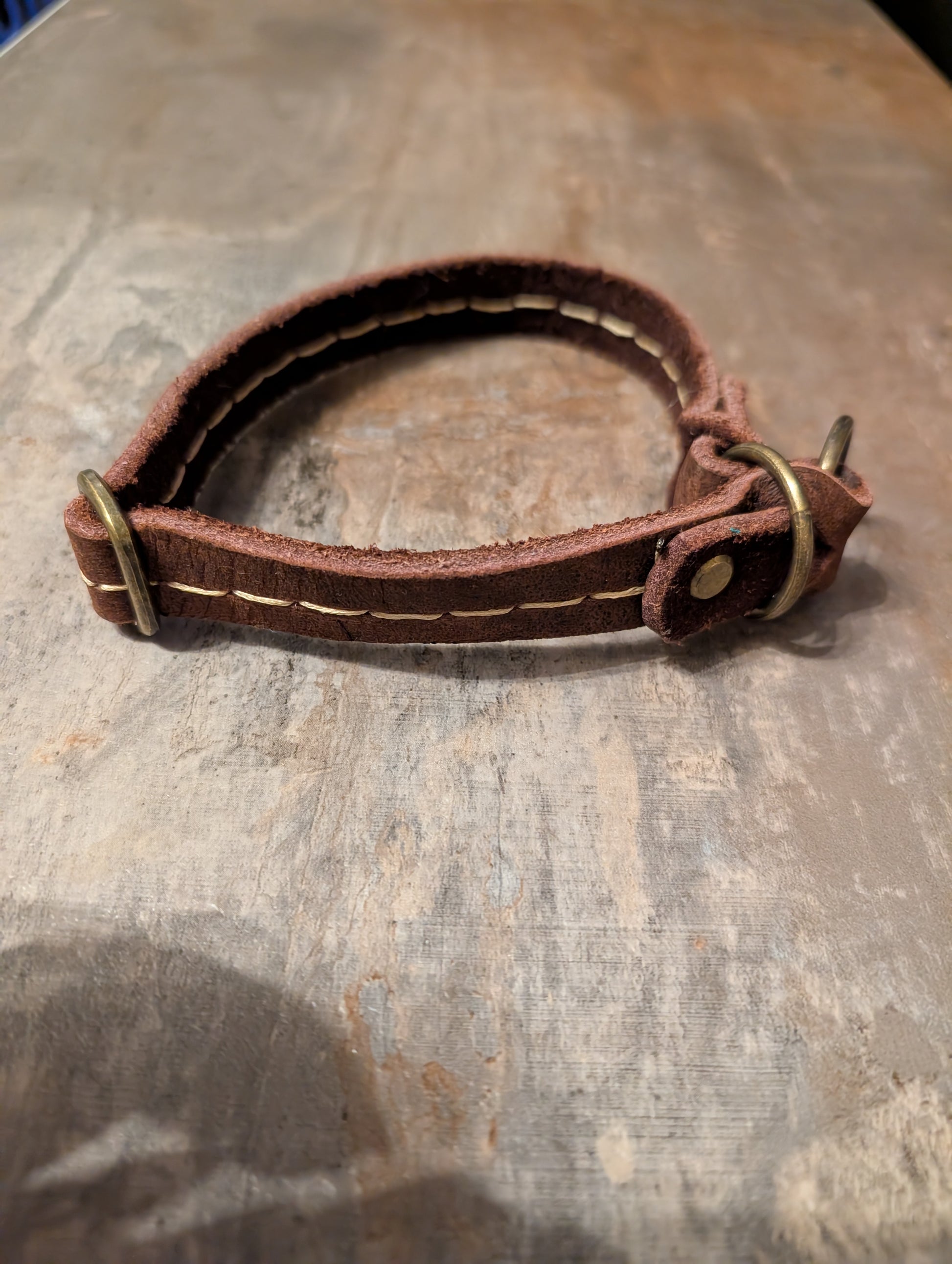 Beiges Halsband aus hochwertigem Fettleder im festen Maß bis 50cm Kopfumfang. Der Stopp ist stufenlos verstellbar. Die Beschläge sind Gold, die Ziernaht ist handgenäht.