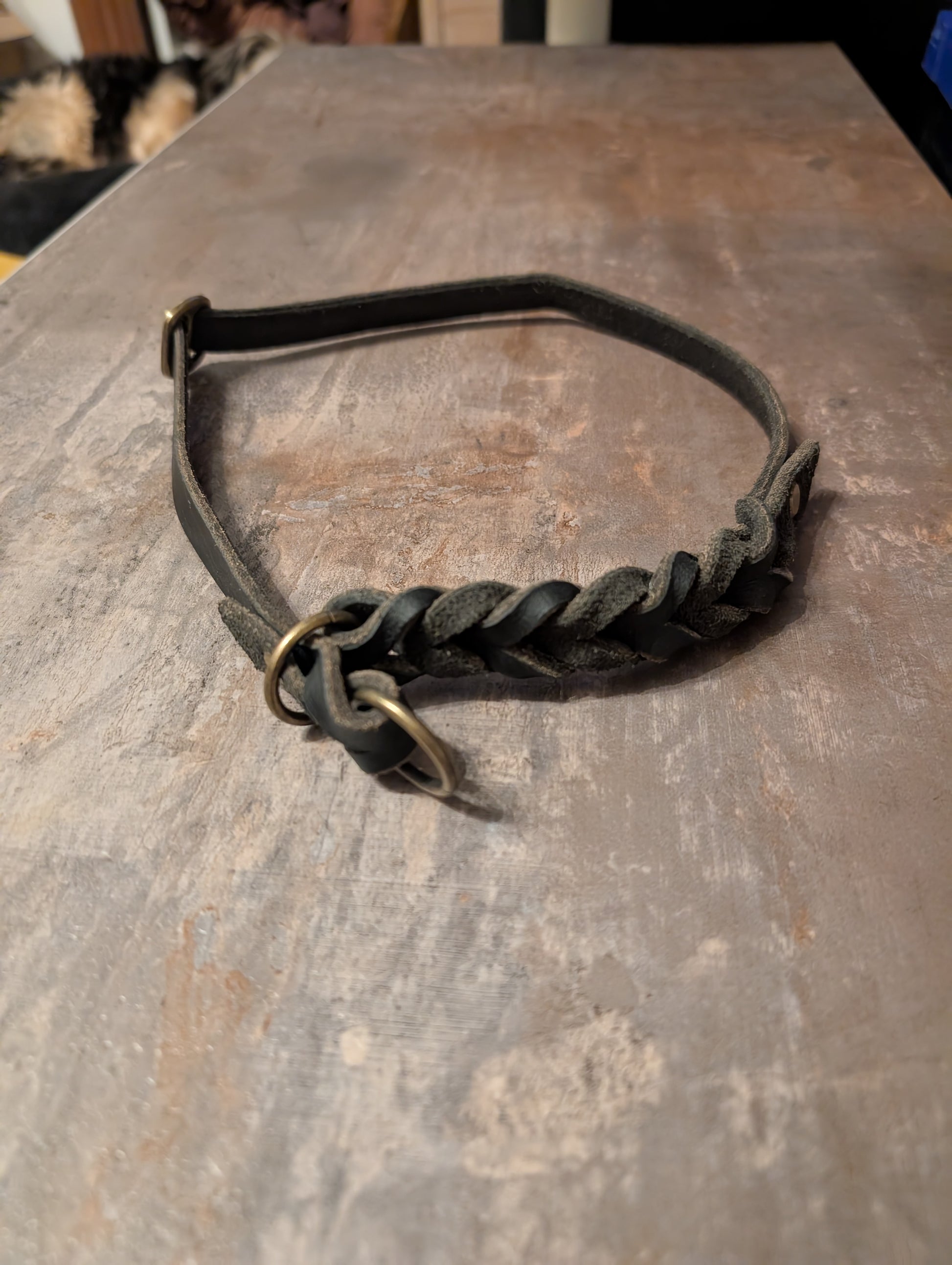 Dunkelbraunes Halsband aus hochwertigem Fettleder im festen Maß bis 58cm Kopfumfang. Der Stopp ist stufenlos verstellbar. Die Beschläge sind Gold.