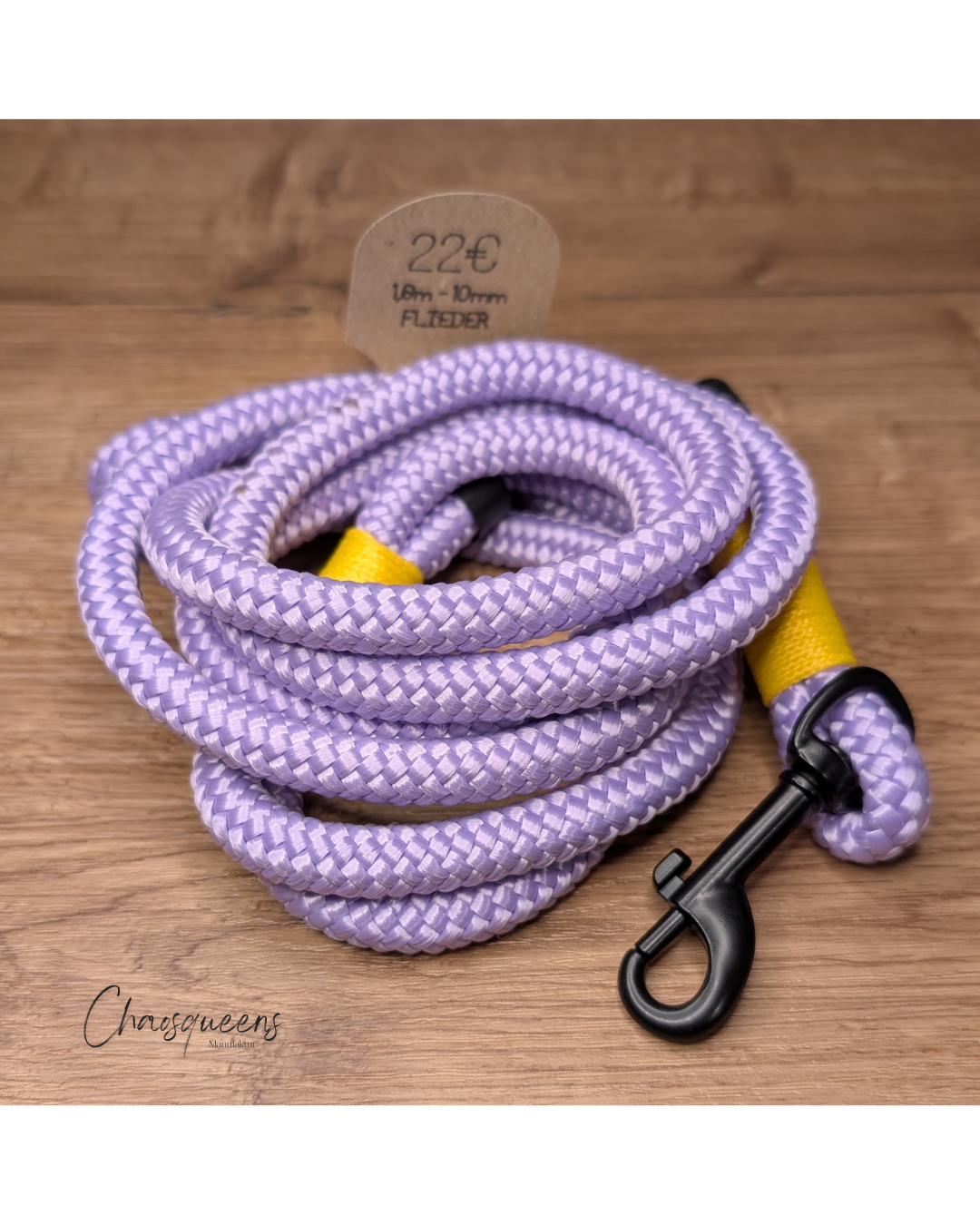 Seilführleine mit Handschlaufe in Flieder 10mm. Die Beschläge sind Schwarz.