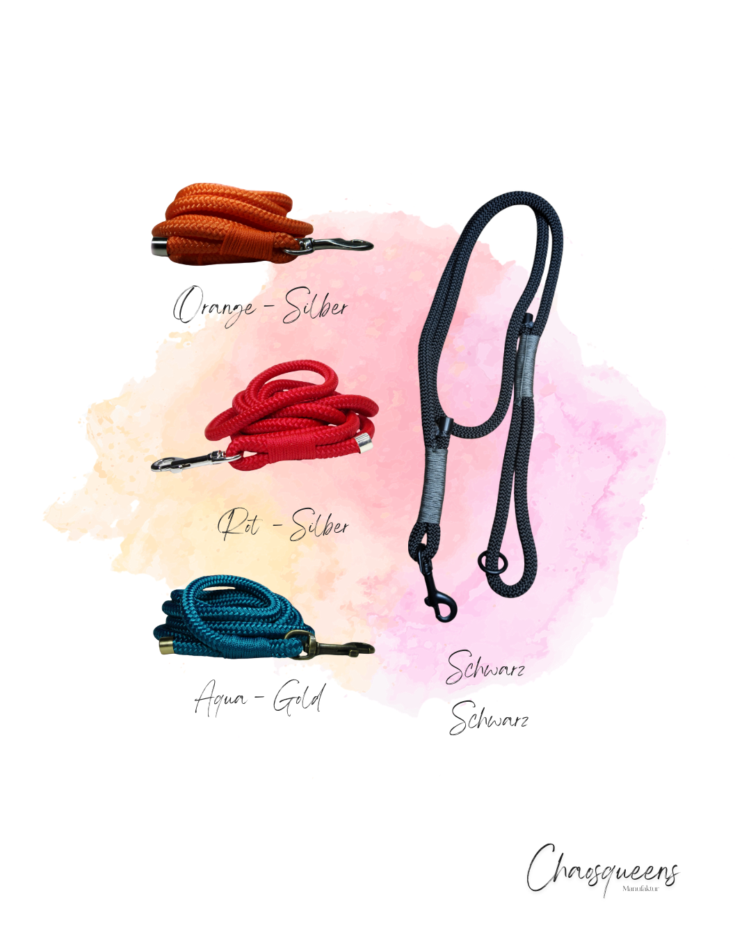 Wähle die perfekte Farbe und passe deine Leine mit unseren vier Beschlagvarianten an: