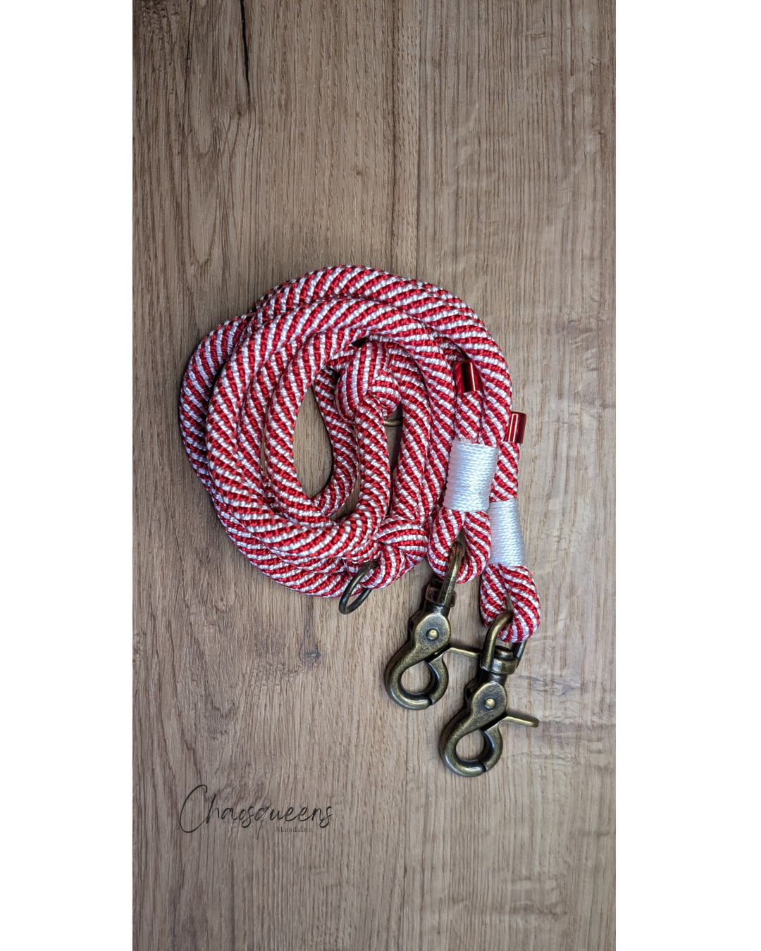 Hergestellt aus hochwertigem 8mm PPM-Seil im klassischen Zuckertangen-Look – rot-weiß gestreift und kombiniert mit goldenen Beschlägen für einen besonders edlen Kontrast.